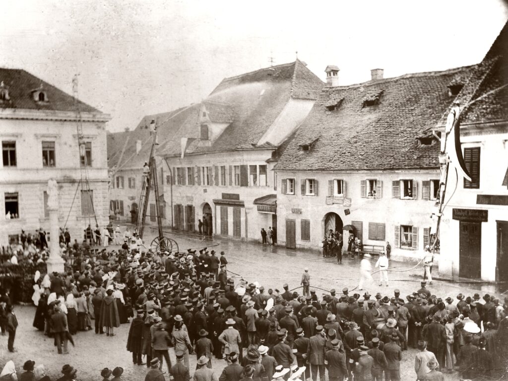 Solo Zündholzfabrik, Stallhof-Stainz um 1900. Im Vordergrund: Barocke Marienstatue mit Kind in der Langwiesengasse, heute am Hauptplatz Stainz.
