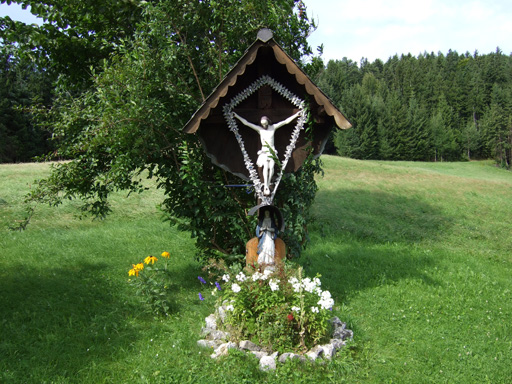 Stand das Kreuz einmal ca. 200 Meter vom Haus entfernt bei einem Lindenbaum, so findet man es heute gegenüber dem Haus der Familie Kainz, vlg.Riegelbauer in Rainbach 46, seit es um das Jahr 1970 dorthin versetzt wurde. Der Kreuzstamm ist an zwei Pfosten angeschraubt, das Satteldach mit Eternitplatten gedeckt, auch die Rückwand, im unteren Bereich in großem Bogen geschnitten, ist mit ebensolchen Platten verkleidet. Flachbogig sind die Giebelbretter geschnitten. Der Korpus mit braun gefasstem Kopf- und Barthaar ist direkt am Kreuz befestigt und mit Faltpapierarbeit an der Raute geschmückt. Die Tafel ist zwar angebracht, doch die INRI Aufschrift fehlt. Unterhalb des Korpus, mit einem eigenen kleinen bogenförmigen Blechdach geschützt, ist eine Marienfigur mit blaugefasstem Umhang gestellt. Ein mit Bruchsteinen umrandetes Blumengarterl, eine Ulme und eine Forsythie hinter dem Kreuz vervollständigen dieses hübsche Ensemble. (Quelle: Winfried Bräunlich - Dr. Dieter Weiss: Zeichen am Weg, Stainz, 2009)