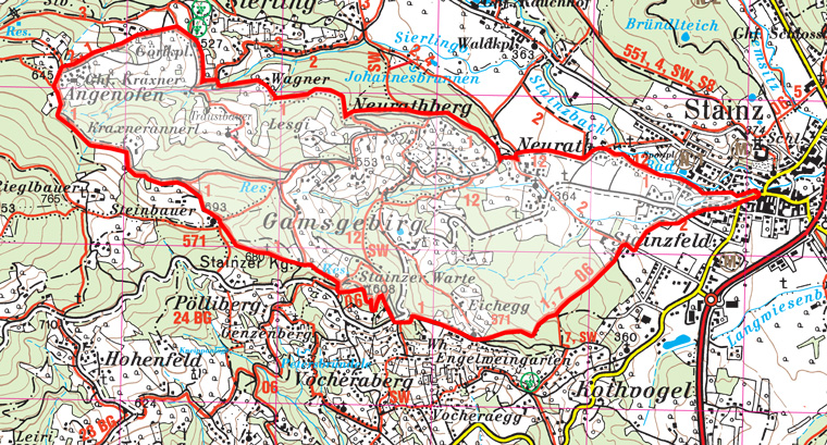 Wanderkarte Stainzer Panoramaweg - Das Koordinatengitter (rot) hat die Größe von 1 km x 1 km.